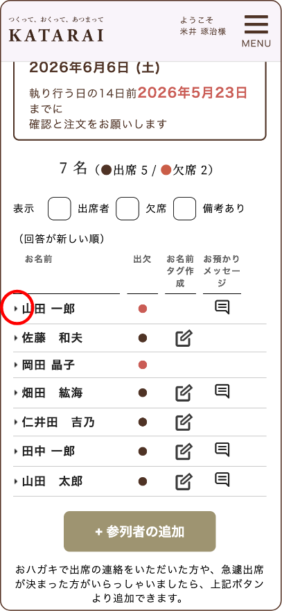 参列者様のお名前をクリックして詳細を開きます。