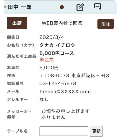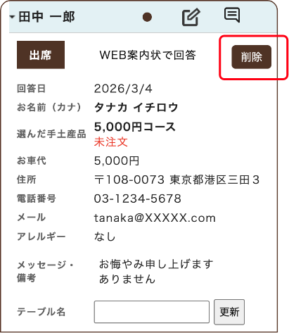 削除をタップすると、該当の参列者様は出欠回答一覧から削除されます。これにより欠席の情報は削除されます。