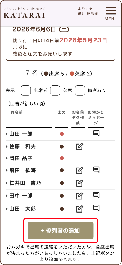 【出欠回答一覧を確認する】→【+参列者の追加】から追加ができます。